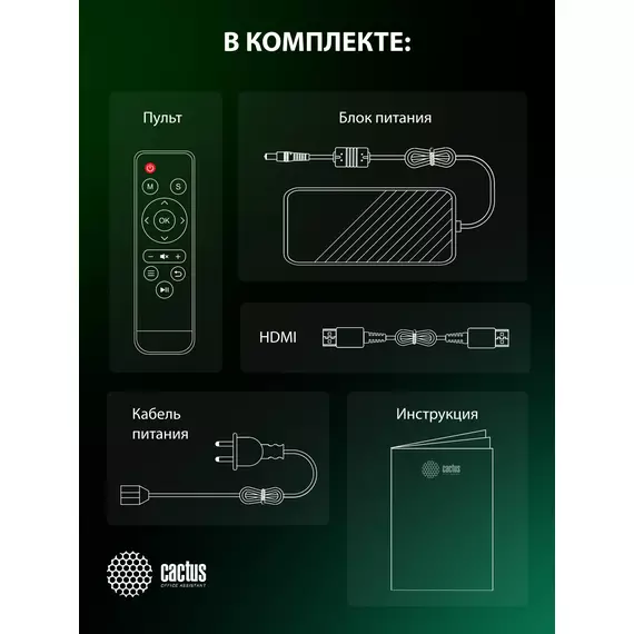 | Комплектация | кабель HDMI 1.5м, 3,5 мм кабель AV, кабель питания, пульт ДУ, салфетка из микрофибры, руководство пользователя |