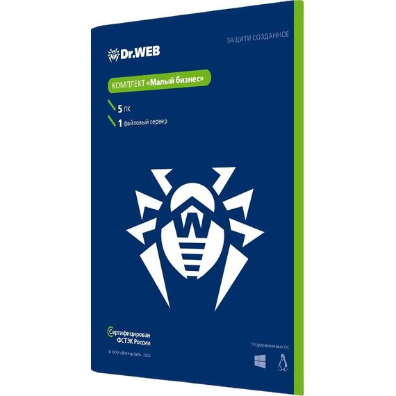 Продукты комплекта: Центр управления Dr.Web Enterprise Security Suite, Dr.Web Desktop Security Suite (5 ПК под управлением Windows, Linux (32- и 64-битные системы), Dr.Web Server Security Suite (1 сервер Windows, Unix (32- и 64-битные системы)). Бонус: Dr.Web Mobile Security Suite (5 моб. устр.)