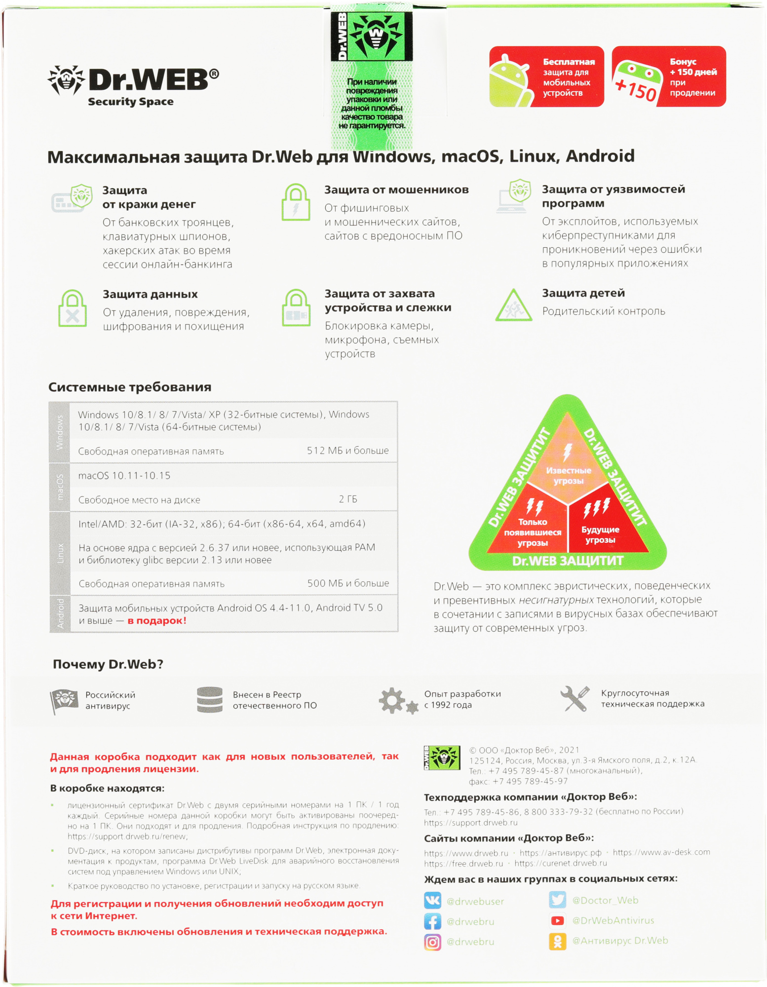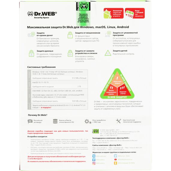 DR.Web Security Space - это комплексная защита (антивирус, антиспам, родительский контроль, брандмауэр, защита от эксплойтов, защита от вымогателей, защита от потери данных, приватность, блокировка съемных устройств, облако Dr.Web) компьютеров под управлением Windows и антивирус для macOS и Linux.