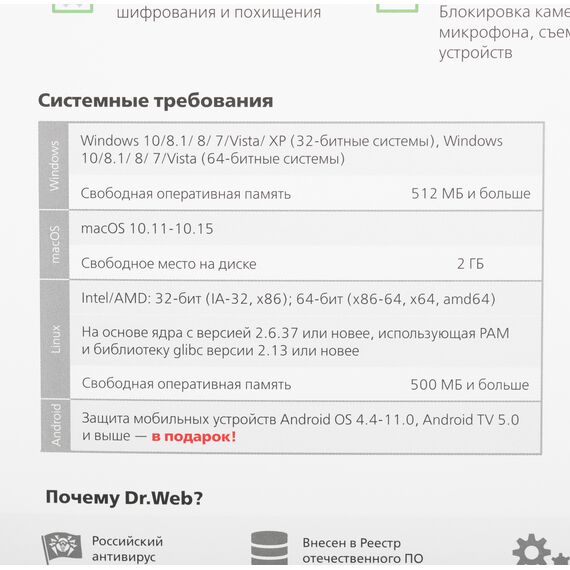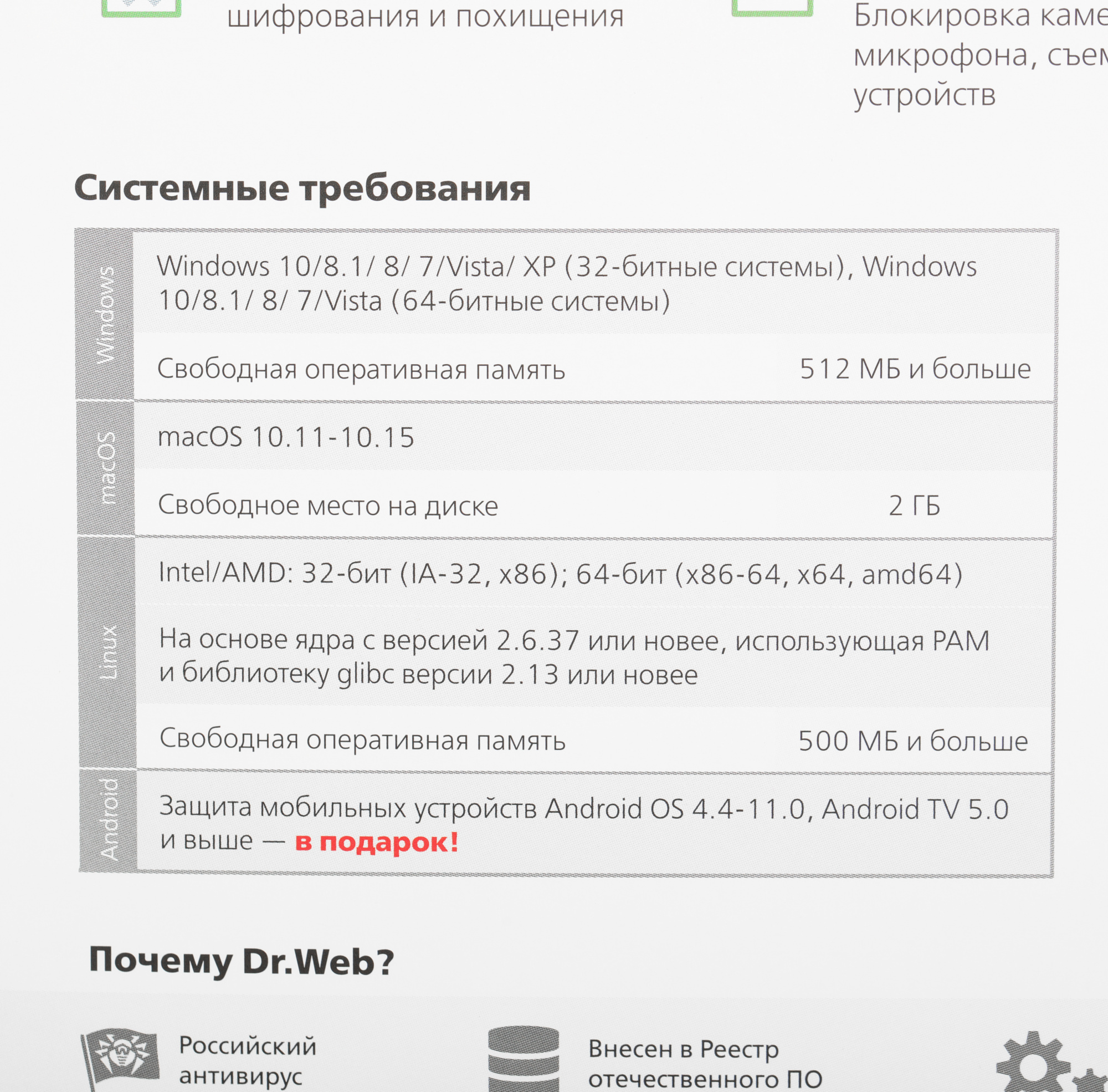 | Состав пакета | 1 лицензионный сертификат Dr.Web с двумя серийными номерами на 1 ПК / 1 год |