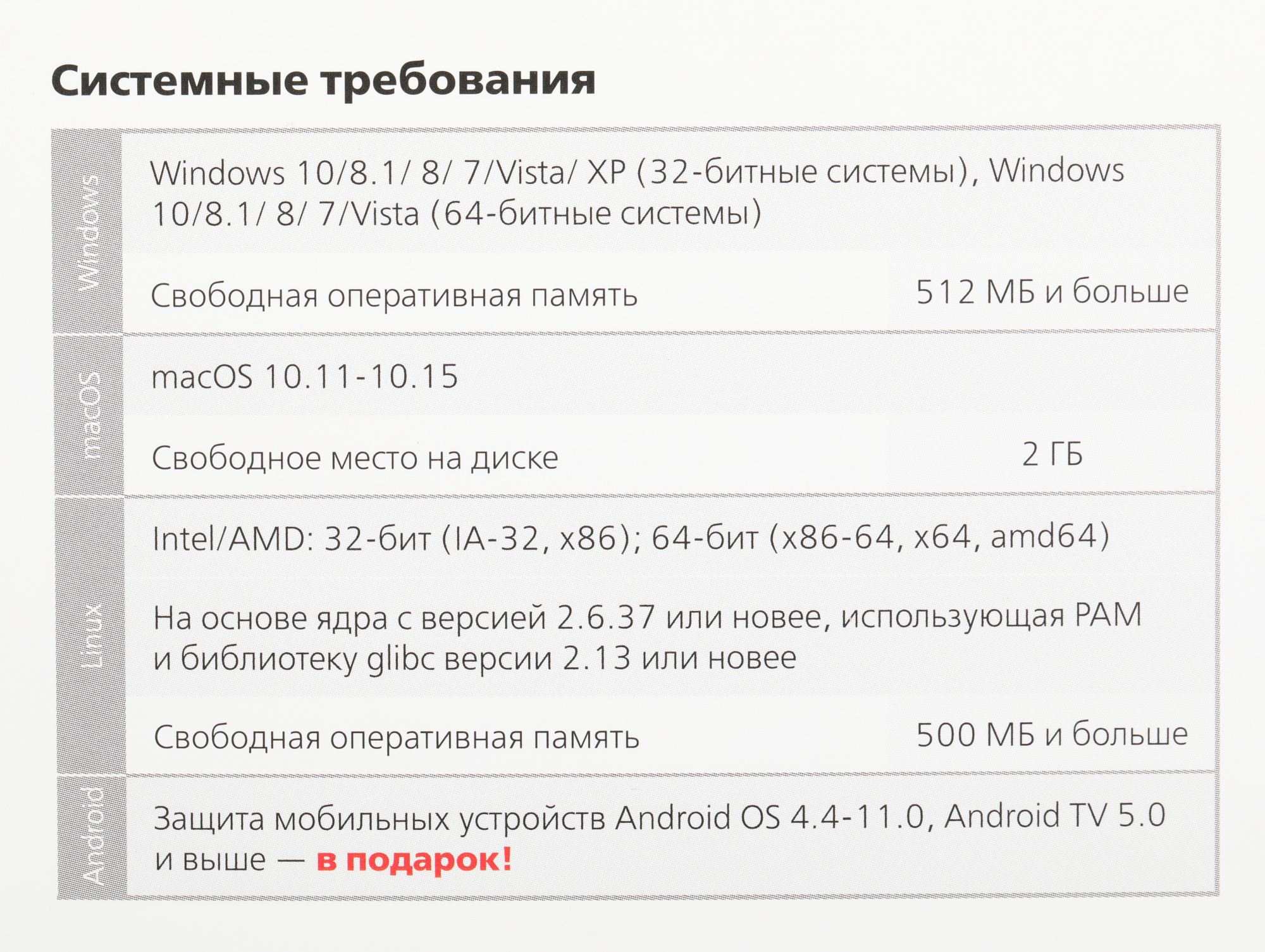 | Поддержка ОС | Windows 10/8/7/Vista (32- и 64-битные системы); macОS 10.7+; дистрибутивы GNU/Linux |