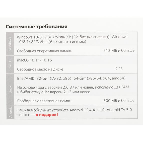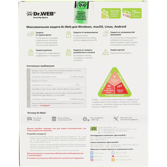 | Состав пакета | 6 программ Dr.Web в одной коробке!Dr.Web Security Space для WindowsDr.Web Security Space (для macOS)Dr.Web Security Space (для Linux)Dr.Web Security Space (для Android)Dr.Web CureIt!Dr.Web LiveDisk |