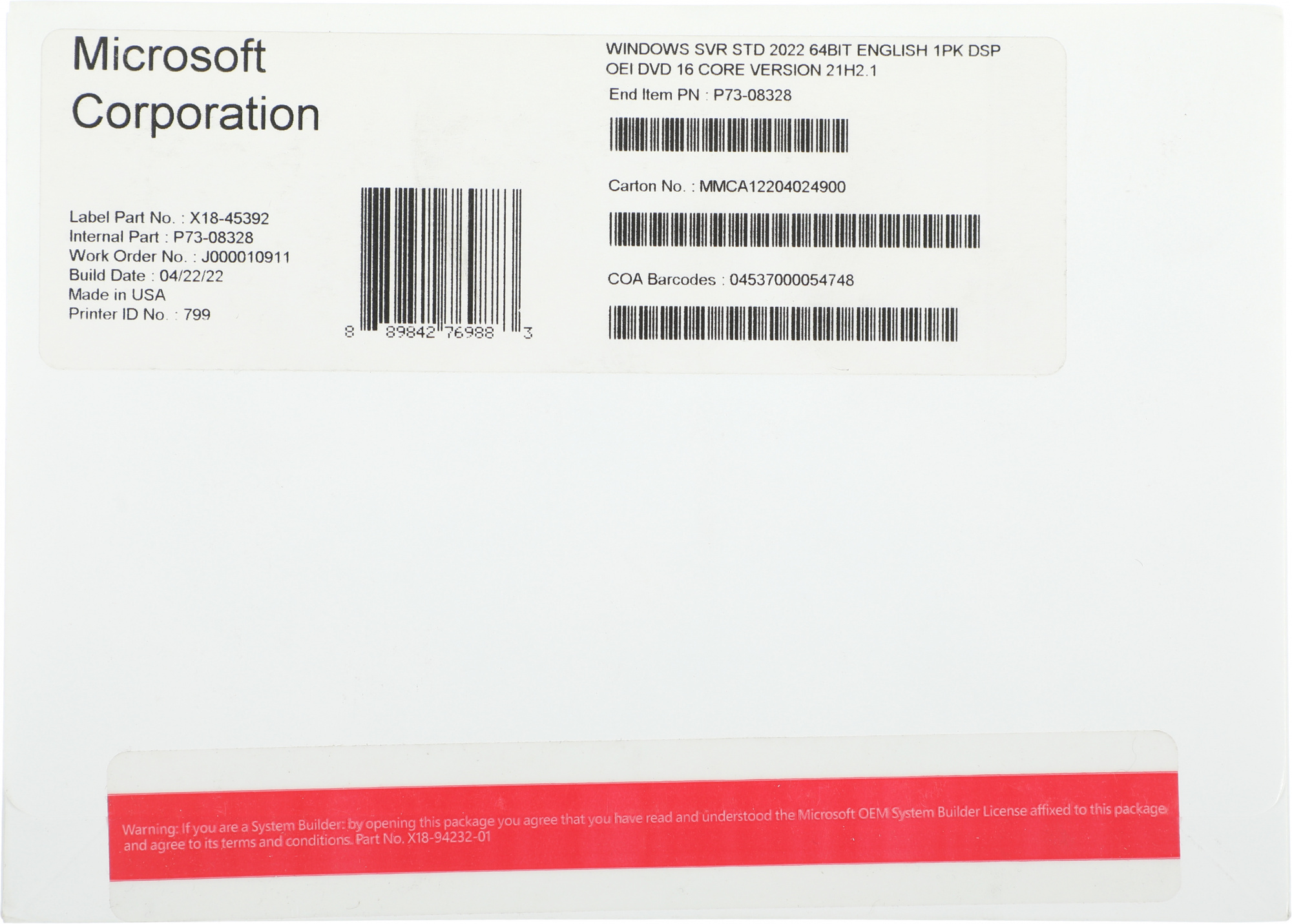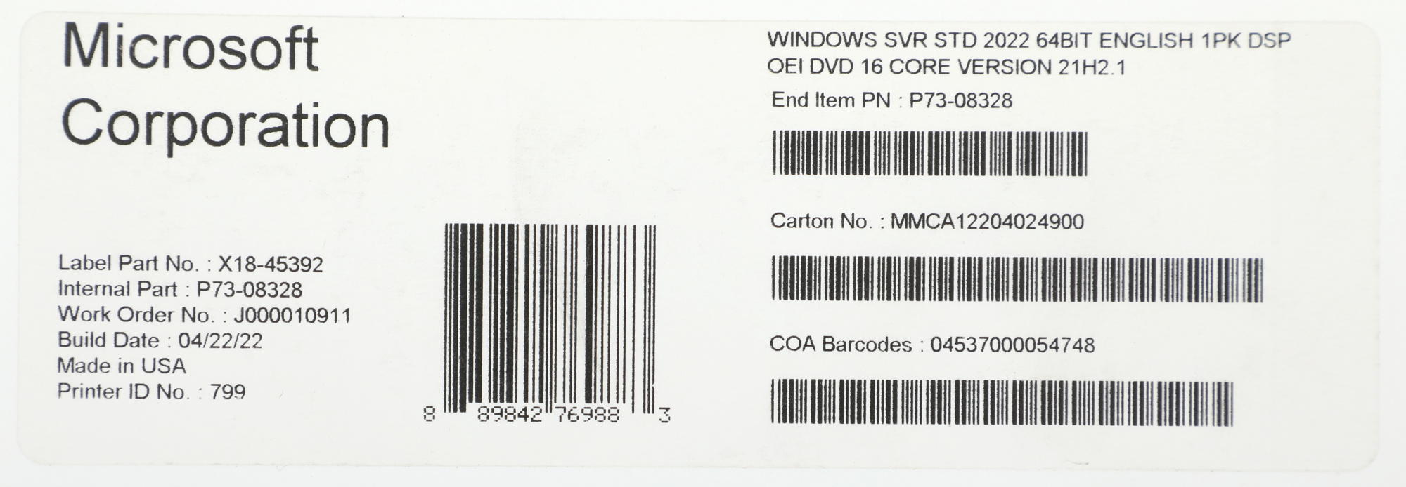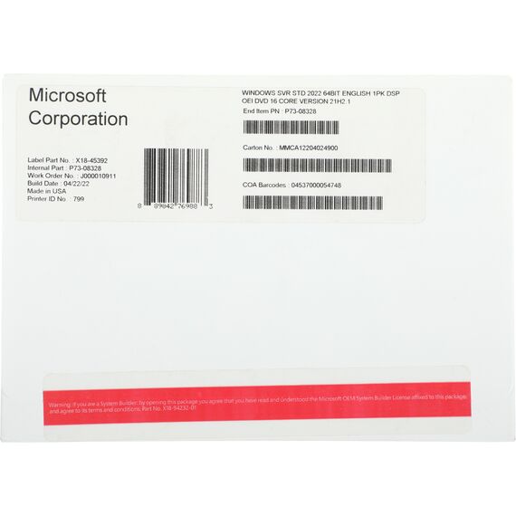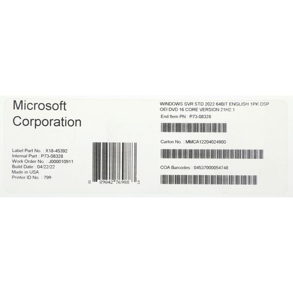 Операционная система Microsoft Windows Svr Std 2022 64Bit Eng 1pk DSP OEI DVD 16 Core [P73-08328]