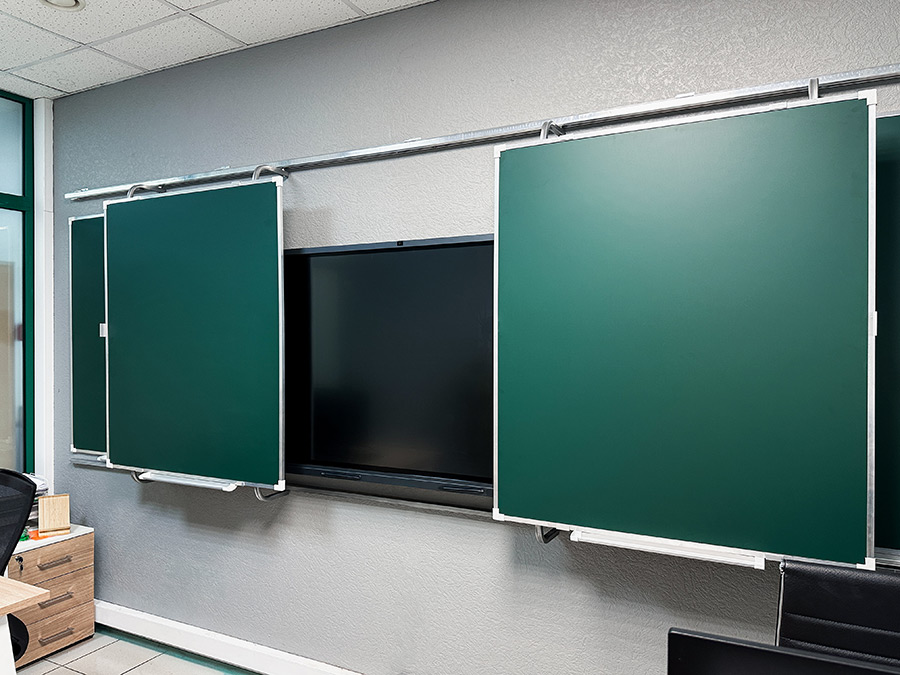 «Эврика» — это рельсовая система с несколькими подвижными и стационарными досками, позволяющая максимально задействовать фронтальную стену аудитории и комбинировать классические доски с интерактивным оборудованием.