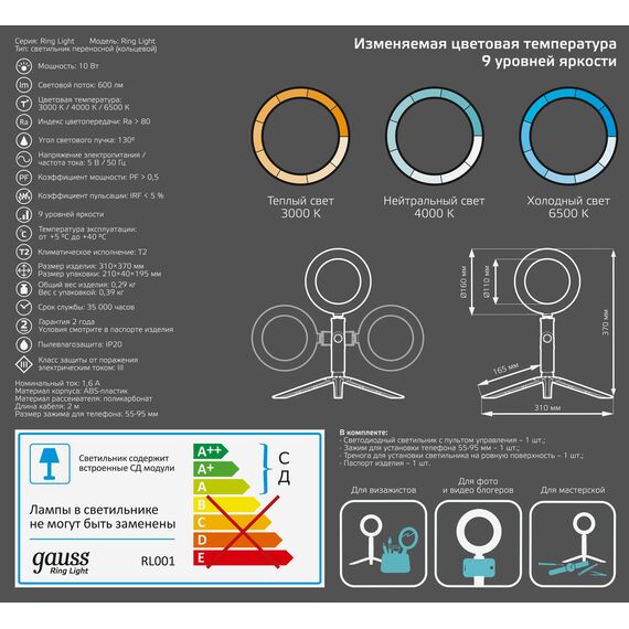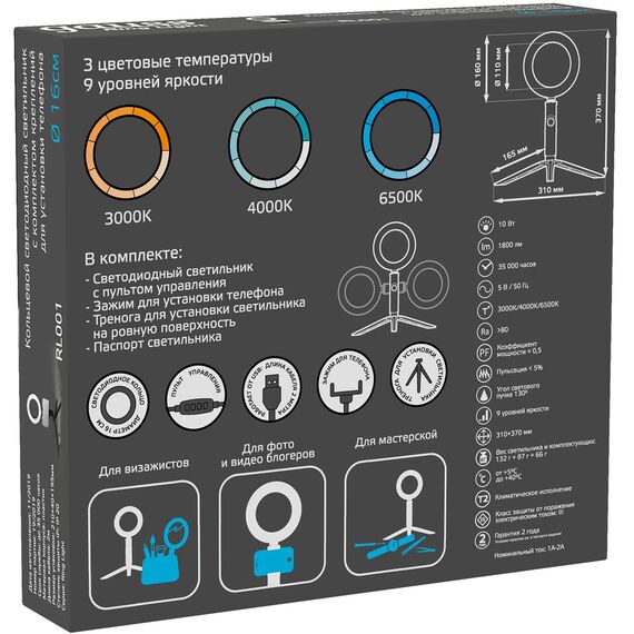| Комплектация | Светильник, зажим для смартфона, тренога, паспорт светильника |
