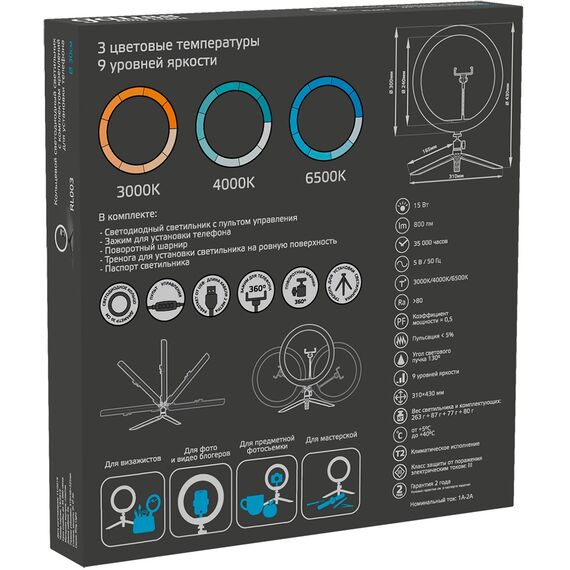 | Комплектация | Светильник, зажим для смартфона, тренога, паспорт светильника |