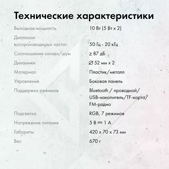 | Режимы прослушивания | USB-подключение, Bluetooth, TF-карта, FM |