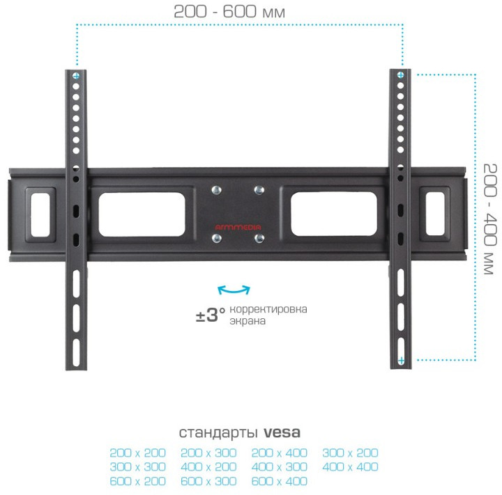 - Крепёжные отверстия ARM MEDIA LCD-418 BLACK изготовлены по стандарту VESA