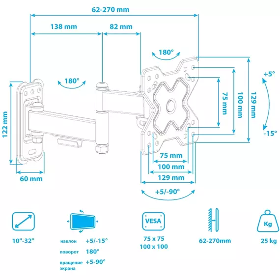| Способ регулировки | поворотно-выдвижной и наклонный |