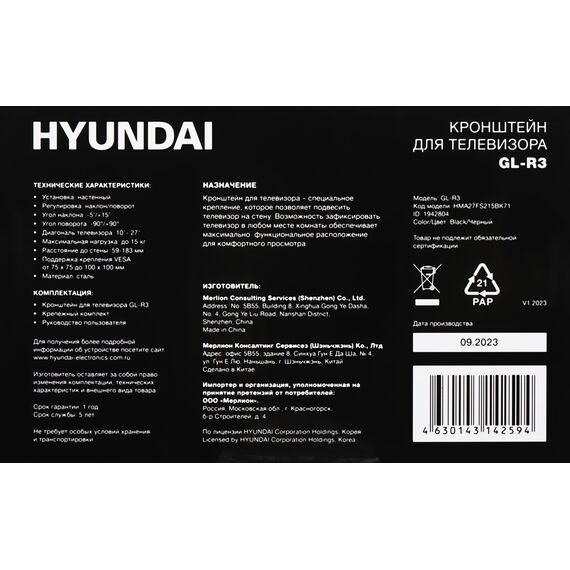 Наличие товара Hyundai GL-R3 [HMA27FS215BK71]
