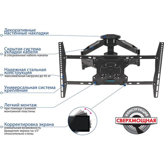 | Особенности | Возможность вращения экрана на ±5 градусов относительно стены, легкий монтаж при помощи съемной монтажной пластины, декоративные настенные накладки |