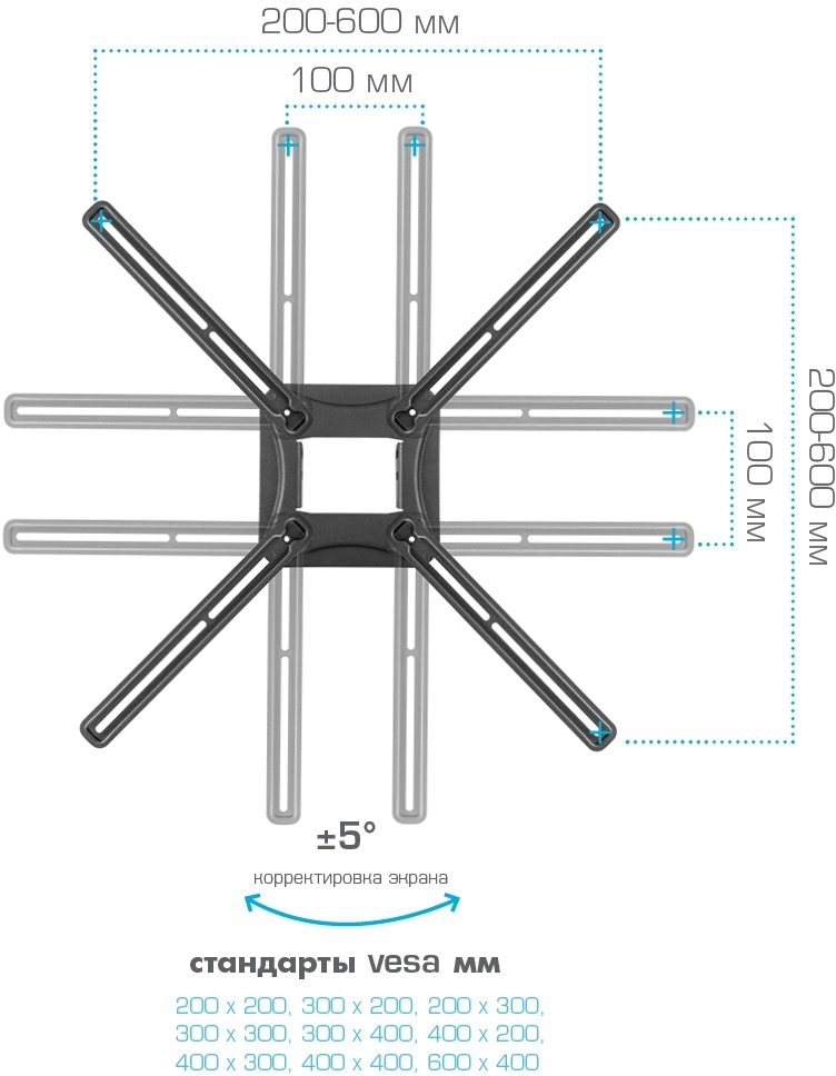 | Поддержка крепления VESA | 200x200, 200x300, 300x200, 300x300, 300x400, 400x200, 400x300, 400x400, 600x400 |