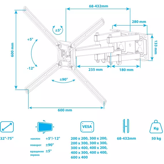 | Подходит для телевизоров c диагональю | 32", 37", 39", 40", 42", 46", 48", 50", 52", 55", 60", 65", 70", 75" |