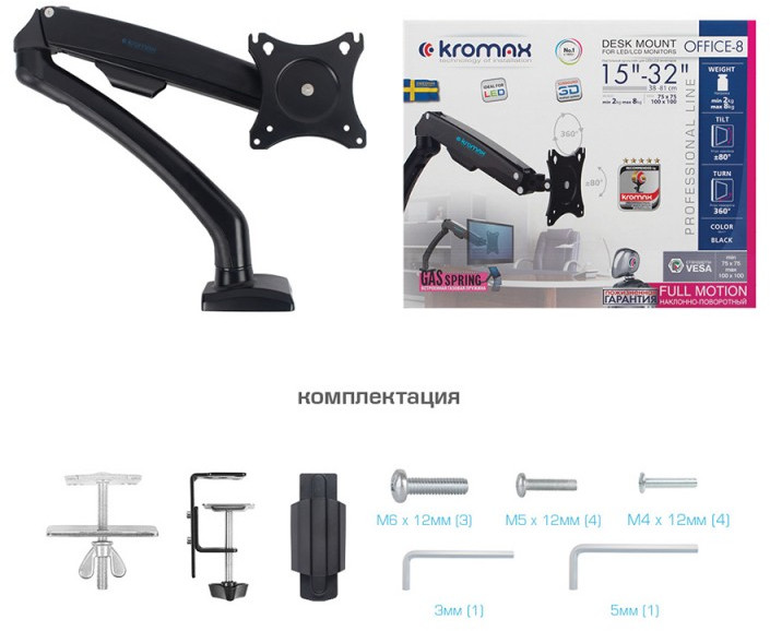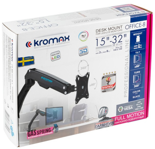 Настольный кронштейн Kromax OFFICE-8 Black VESA75-100, 15-32", 2-8кг