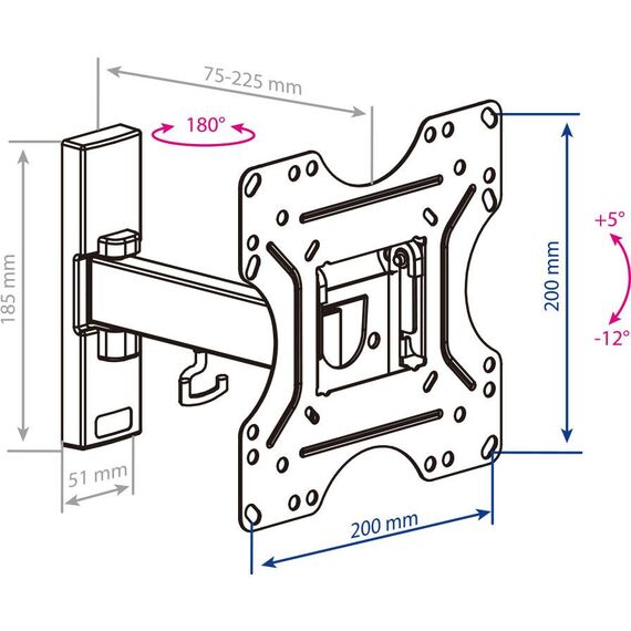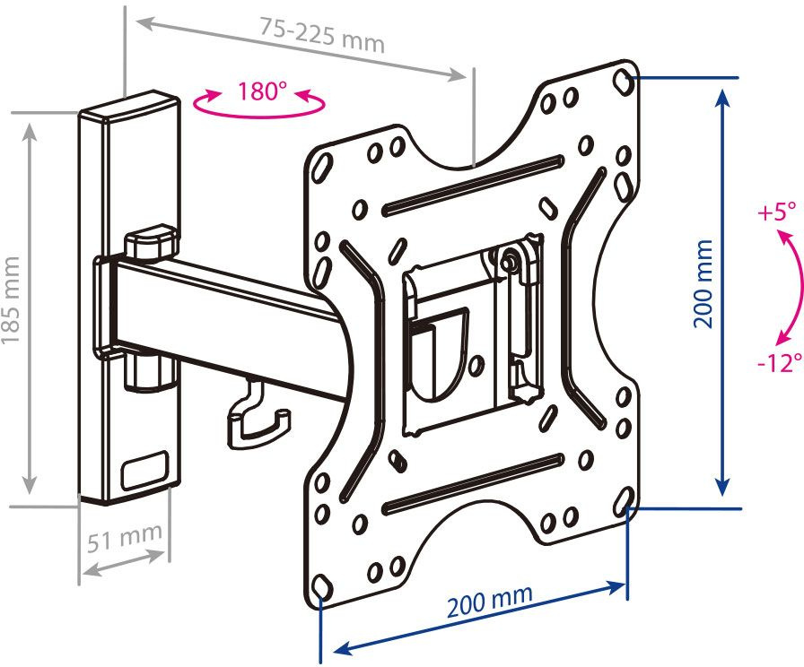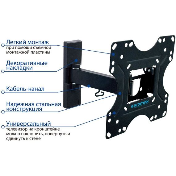 Легкий монтаж при помощи съемной монтажной пластины. Надежная стальная конструкция. Универсальный телевизор на кронштейне можно наклонить, повернуть и сдвинуть к стене. Декоративные накладки. Кабель-канал.