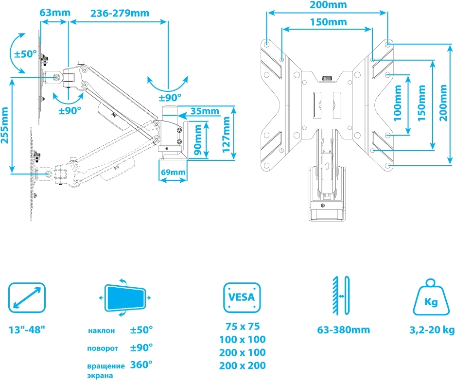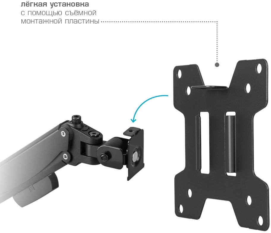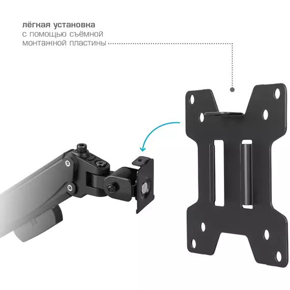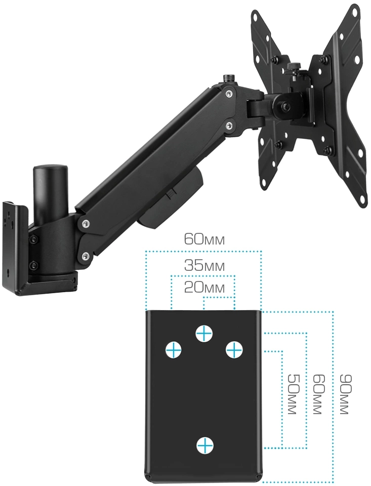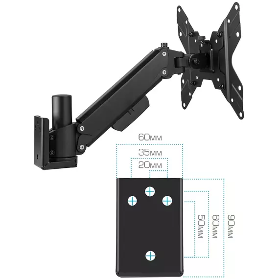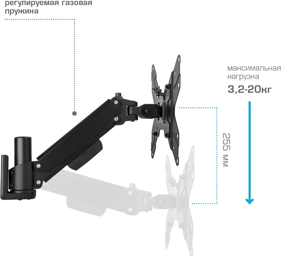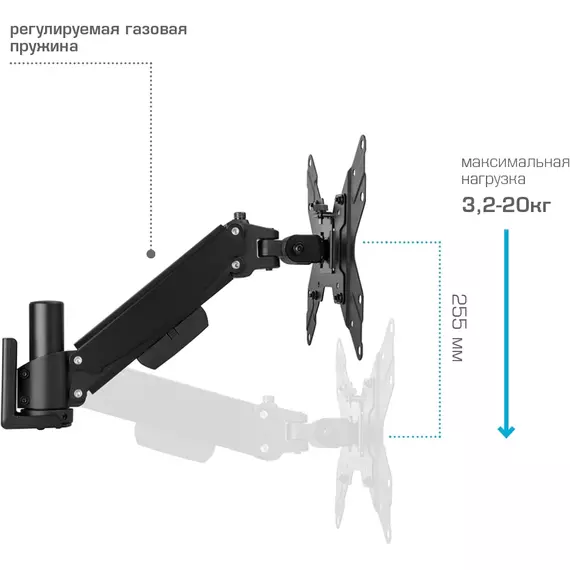 | Особенности | Универсальная система крепления, Легкий монтаж при помощи съемной монтажной пластины, Регулирующаяся газовая пружина, Мощная стальная конструкция - максимальная нагрузка 3,2-20 кг, Кабель канал |