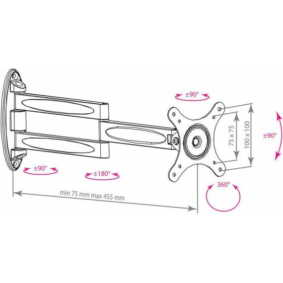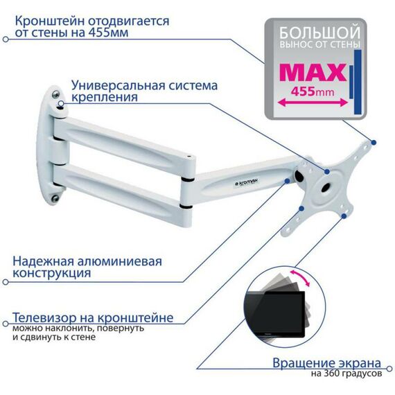 Надежная алюминиевая конструкция. Универсальная система крепления. Кронштейн отодвигается от стены на 455 мм. Телевизор на кронштейне можно наклонить, повернуть и сдвинуть к стене.