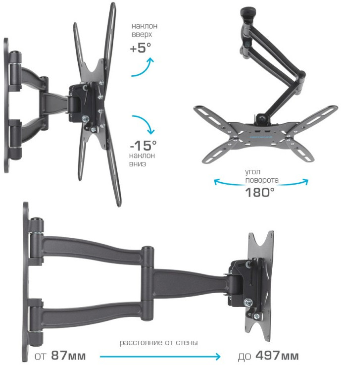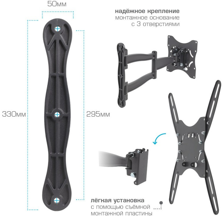- Надежная алюминиевая конструкция, Съемная монтажная пластина, Вращение экрана ±3°, Максимальная степень подвижности