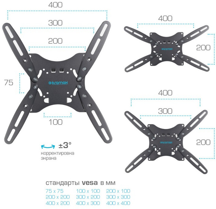 - Крепежные отверстия (VESA) 75 x 75, 100 x 100, 200 x 100, 200 x 200, 300 x 200, 300 x 300, 400 x 200, 400 x 300, 400 x 400