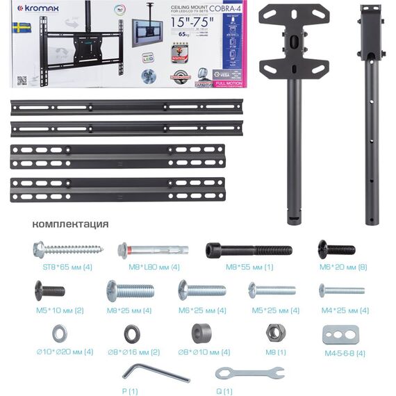 Кронштейн для ТВ Kromax Cobra-4 15"–75", до 65 кг, Vesa 100 x 100, 200 x 100, 200 x 200, 300 x 300, 400 x 400, 400 x 200, 600 x 400, 300 x 200, 400 x 300 мм., расстояние от стены до 1215 мм, черный