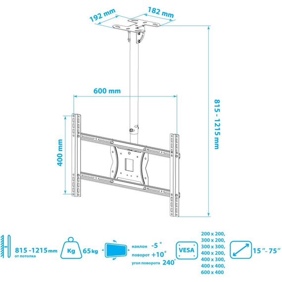 - Стандарт размеров крепления (VESA): 100 x 100, 200 x 100, 200 x 200, 300 x 300, 400 x 400, 400 x 200, 600 x 400, 300 x 200, 400 x 300