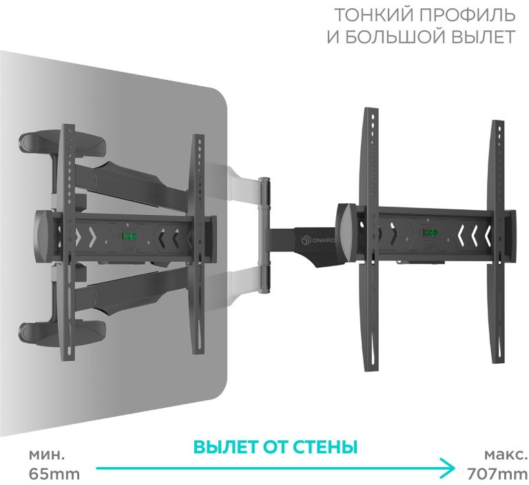 - Тонкий профиль – в сложенном состоянии ширина кронштейна составляет всего 6,3 см – делает кронштейн незаметным за Вашей ТВ-панелью