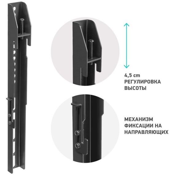 Вертикальные направляющие ONKRON для видео стен нерегулируемые, без наклона. VESA: 200x200, 200x300, 300x200, 300x300, 300x400, 400x200, 400x300, 400х400 мм. Материал: холоднокатаная сталь, SPCC class. Регулировка длины, регулировки наклона нет.