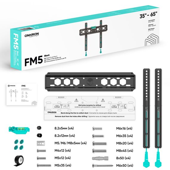 Настенный кронштейн ONKRON FM5 предназначен для телевизоров с диагональю от 35 до 65 дюймов . Максимальный выдерживаемый вес составляет 57 кг.