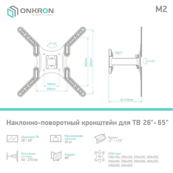 Настенный наклонно-поворотный кронштейн ONKRON M2 предназначен для ТВ с диагональю от 26 до 65 дюймов. Максимальный выдерживаемый вес составляет 35 кг.