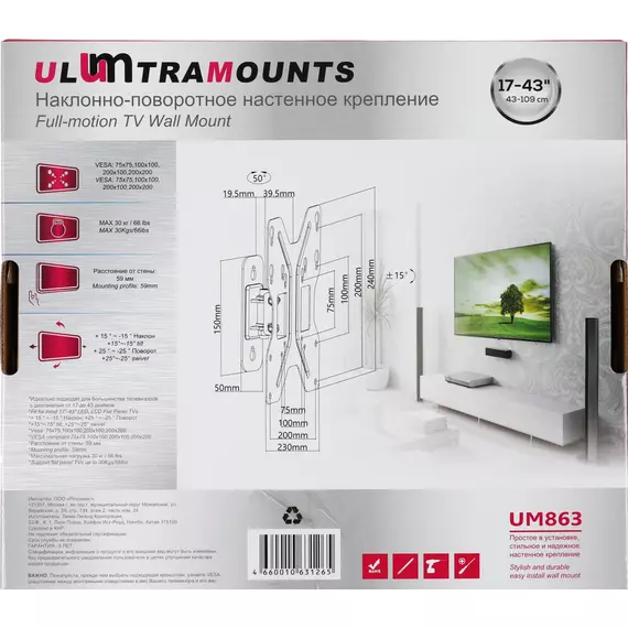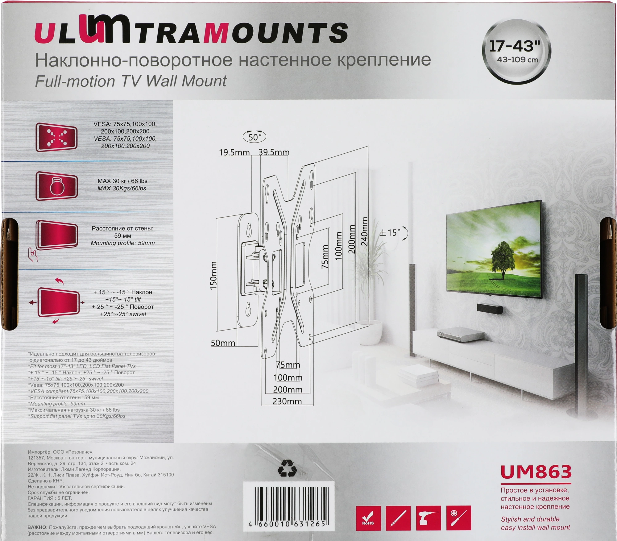Кронштейн для телевизора Ultramounts UM863 черный 23"-42" макс.30кг настенный наклон
