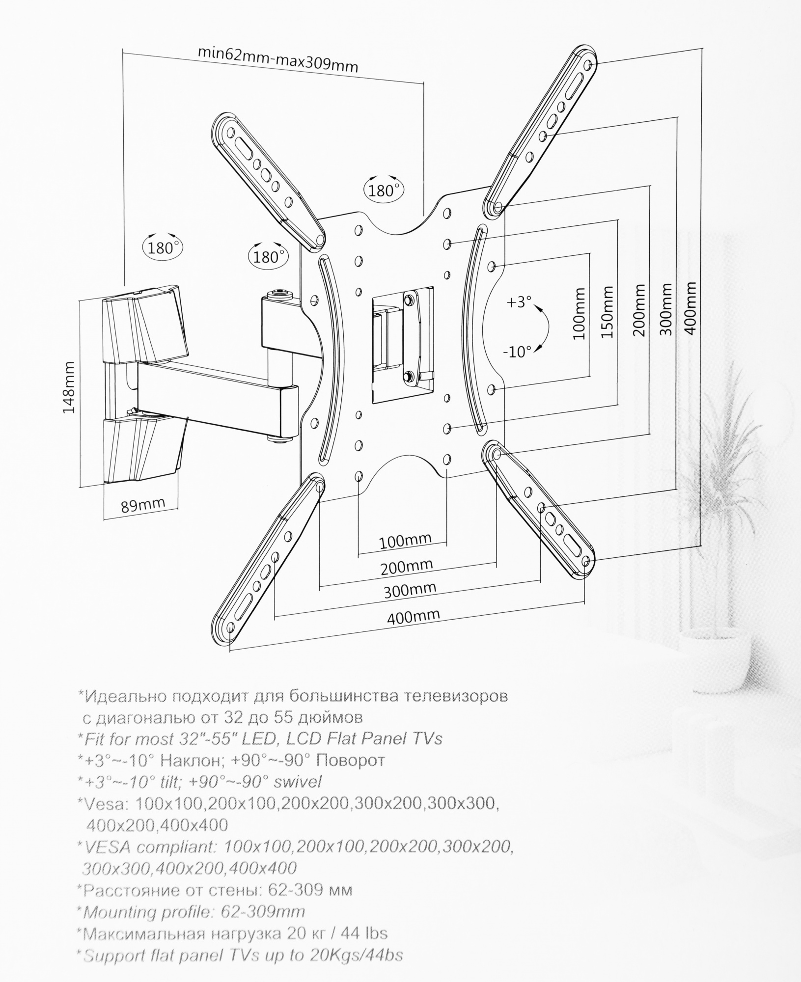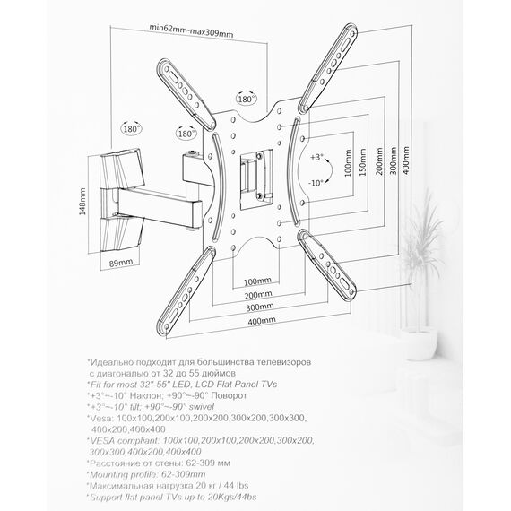 | Подходит для телевизоров c диагональю | 32", 37", 39", 40", 42", 46", 48", 50", 52", 55" |