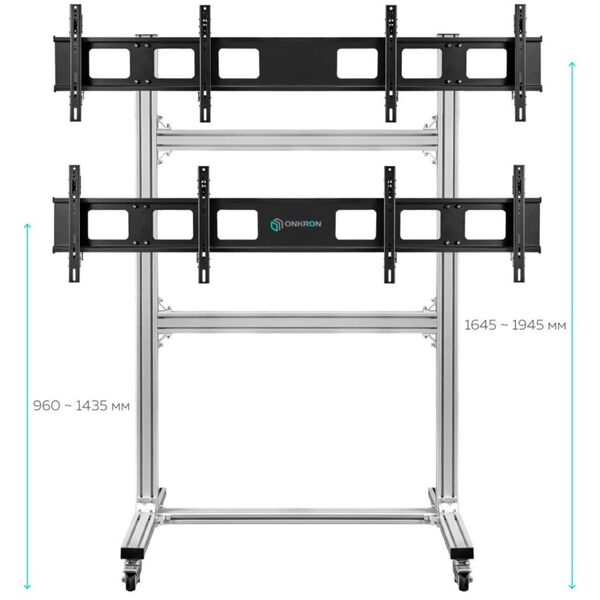 Напольный мобильный стенд для видеостен ONKRON FSPRO2L-22 предназначен для размещения четырех digital-панелей диагональю от 40 до 55 дюймов. Максимальный выдерживаемый вес каждого из четырех экранов составляет 50 кг.