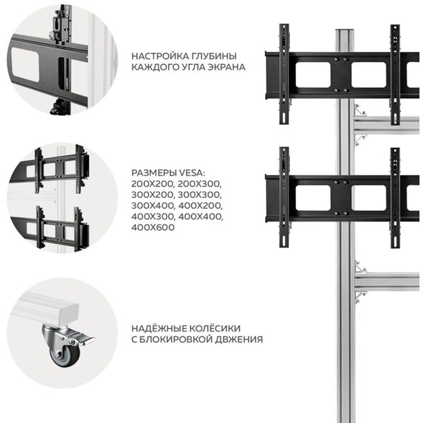 Особенности | Различные варианты крепления VESA. Конструктивные особенности. Широкие возможности регулировки. Надёжные колёса с системой фиксации. |