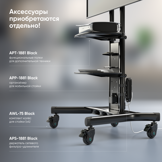Высококачественные колеса с резиновым покрытием обеспечивают плавное и легкое передвижение стойки на любой поверхности, при этом не оставляя никаких следов. Колеса можно заблокировать, чтобы предотвратить нежелательное движение стойки и обеспечить максимальную безопасность вашего телевизора.