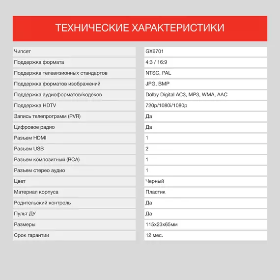 | Особенности | кнопки управления на корпусе, дисплей (каналы или часы). При подключении к интернету (USB WiFi адаптер на чипсете MTK MT7601 приобретается отдельно) доступны YouTube, Погода, RSS новости, IPTV, MEGOGO. В комплекте: ТВ-ресивер, пульт ДУ и батарейки к нему, видеокабель RCA, блок питания, инструкция |