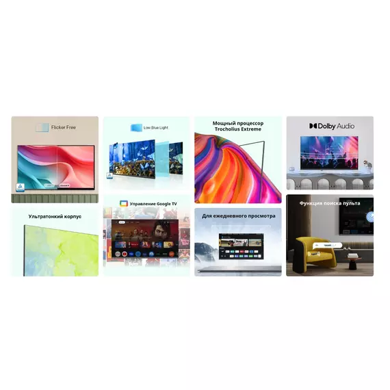 | Особенности | Технологии защиты зрения: Low Blue Light (сниженный синий свет), Flicker Free (антимерцание), Функция поиска ПДУ, Антибактериальный ПДУ |