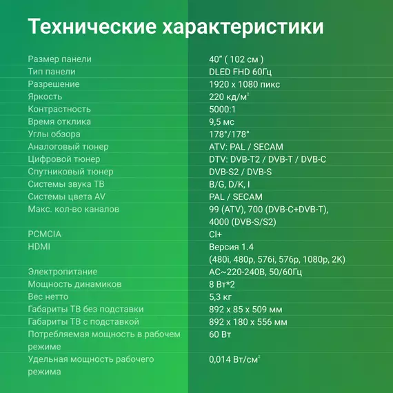 | Энергопотребление в режиме ожидания | 0.5 Вт |