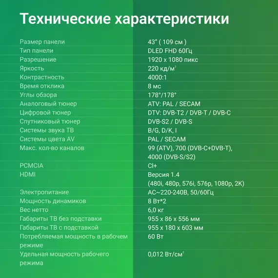 | Диагональ экрана (дюймы) | 43 " |