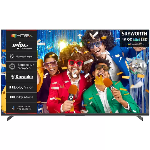 | Особенности | Караоке режим на базе ИИ через пульт ДУ; Встроенный сабвуфер и саундбар; Матовый экран с антибликовым покрытием; Режим Filmmaker Mode; Технологии защиты зрения: Low Blue Light (сниженный синий свет), Flicker Free (антимерцание); |