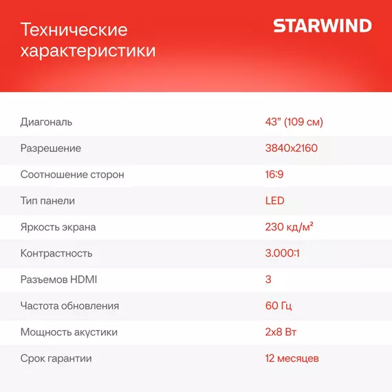 Телевизор LED STARWIND SW-LED43UG403 43" Яндекс.ТВ Frameless черный 4K Ultra HD 60Hz DVB-T DVB-T2 DVB-C DVB-S DVB-S2 USB WiFi Smart TV