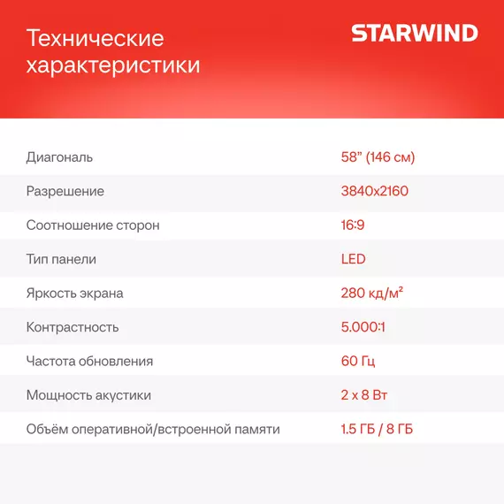 Телевизор STARWIND SW-LED58UG401 LED 58" Яндекс.ТВ Frameless стальной 4K Ultra HD 60Hz DVB-T DVB-T2 DVB-C DVB-S DVB-S2 USB WiFi Smart TV