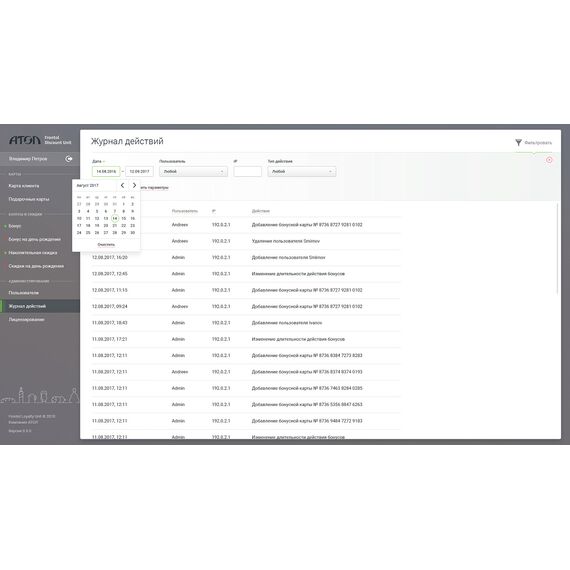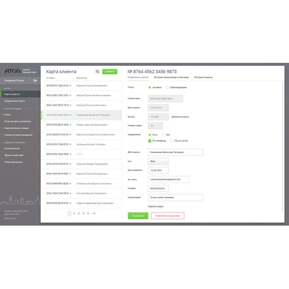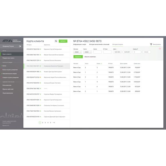 - Идентификация клиента по номеру телефона (с подтверждением через SMS) или номеру карты
