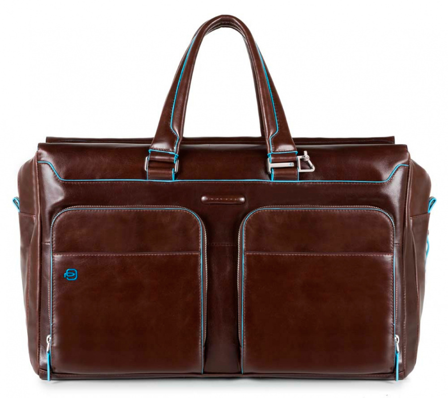 Кожаная дорожная сумка Piquadro из коллекции Blue Square. Сумка изготовлена из мягкой телячьей кожи с восковой пропиткой и фирменным голубым кантом. Имеет одно большое-основное отделение, куда с легкостью поместятся Ваши вещи, а также еще два отделения, одно из которых предназначено для 15' ноутбука