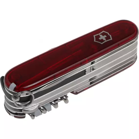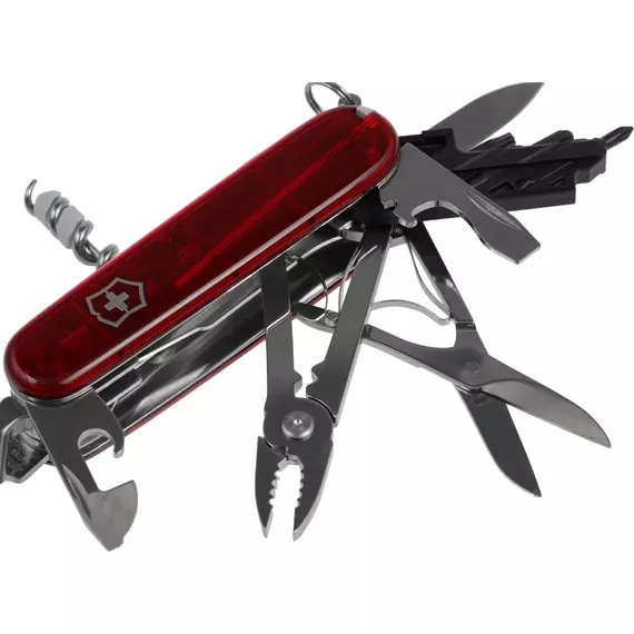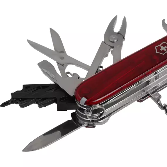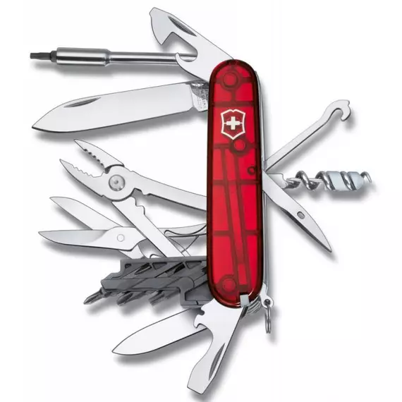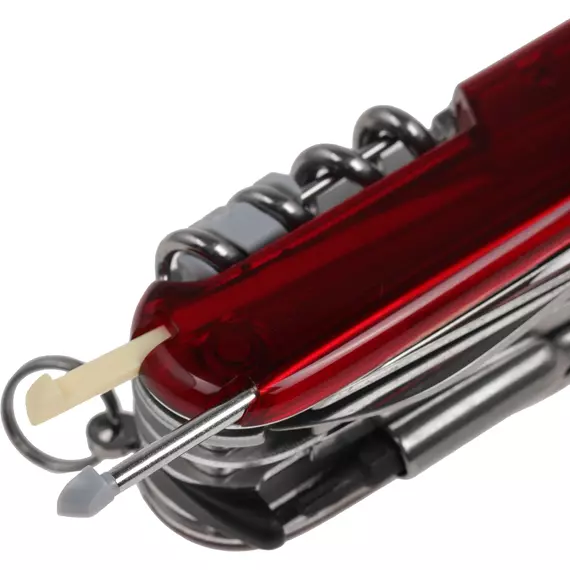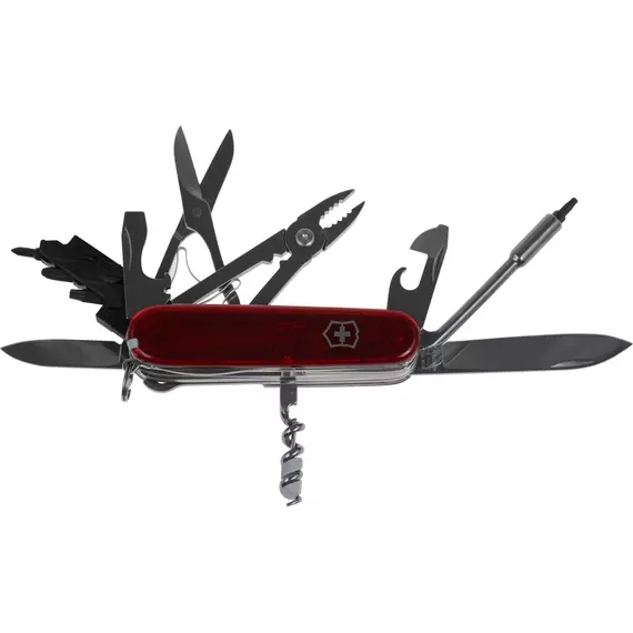| Список функций | большое лезвие, малое лезвие, штопор, консервный нож с малой отверткой, открывалка для бутылок с отверткой - инструментом для снятия изоляции, шило, кернер, кольцо для ключей, пинцет, зубочистка, ушко для шитья, шариковая ручка, инструмент для переключения DIP-переключателей, |