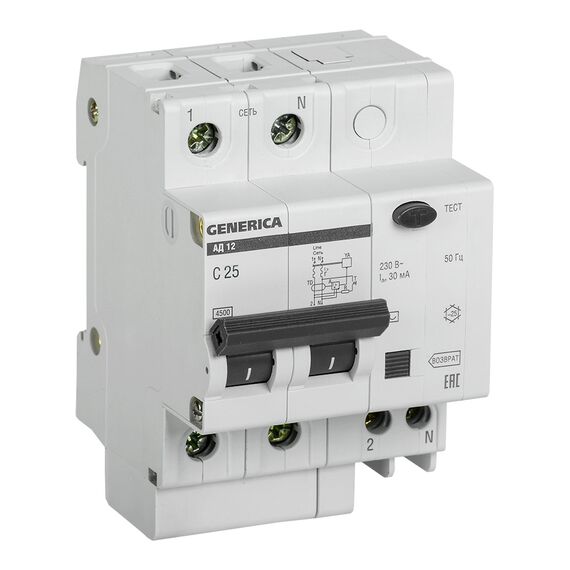 Выключатель автом. дифф. тока IEK MAD15-2-025-C-030 АД12 Generica 25A тип C 4.5kA 30мА AC 2П 230В 4мод серый
