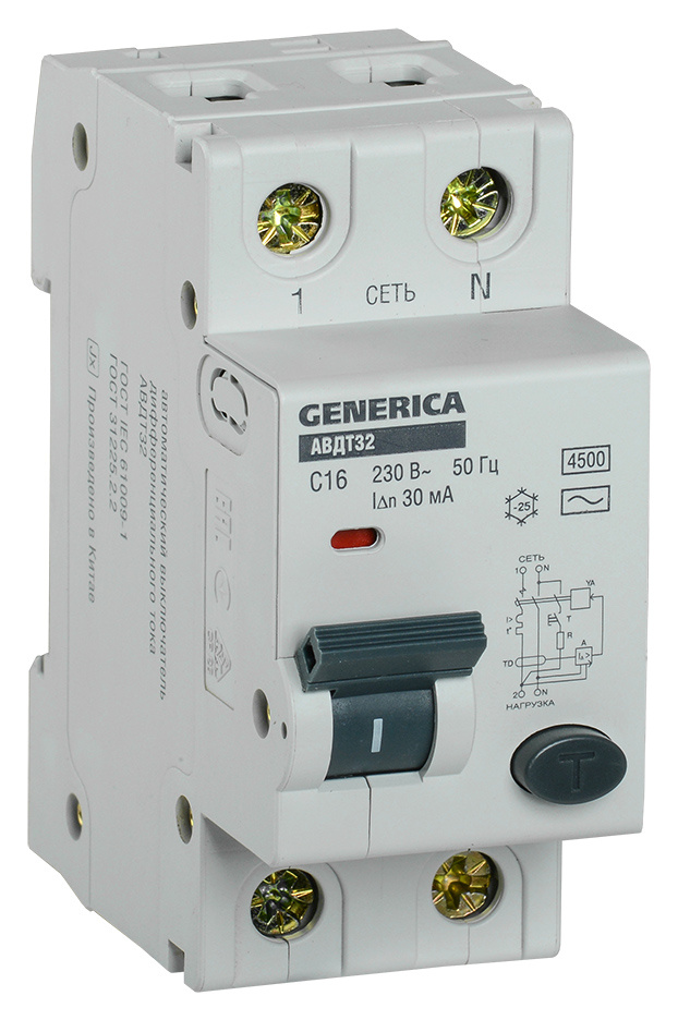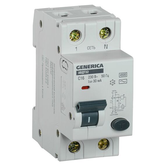 Выключатель IEK MAD25-5-016-C-30 автом. дифф. тока 32 Generica 16A тип C 6kA 30мА AC 2П 230В 2мод серый