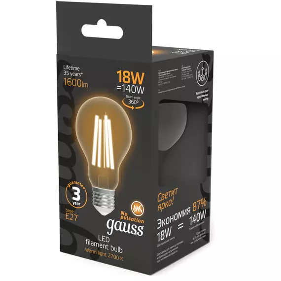 Лампа филаментная Gauss Filament 18Вт цок.:E27 груша 220B св.свеч.бел.теп. [102902118]