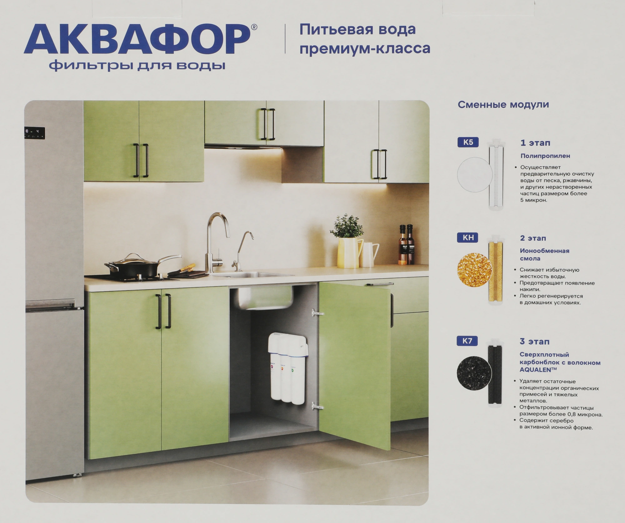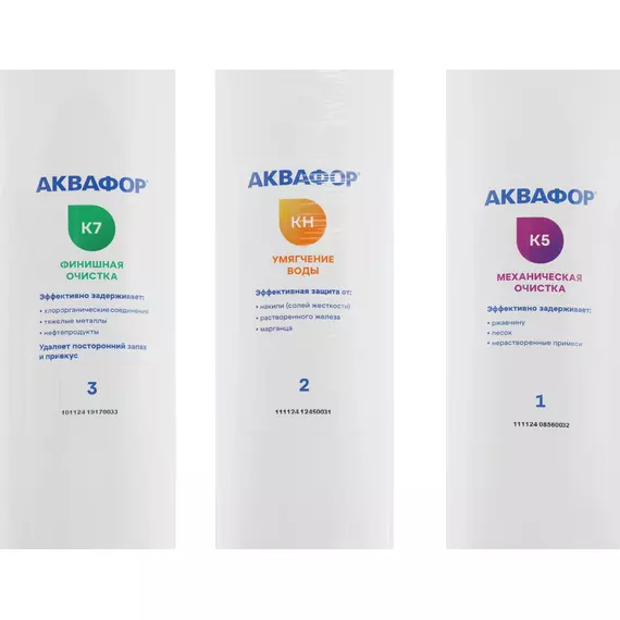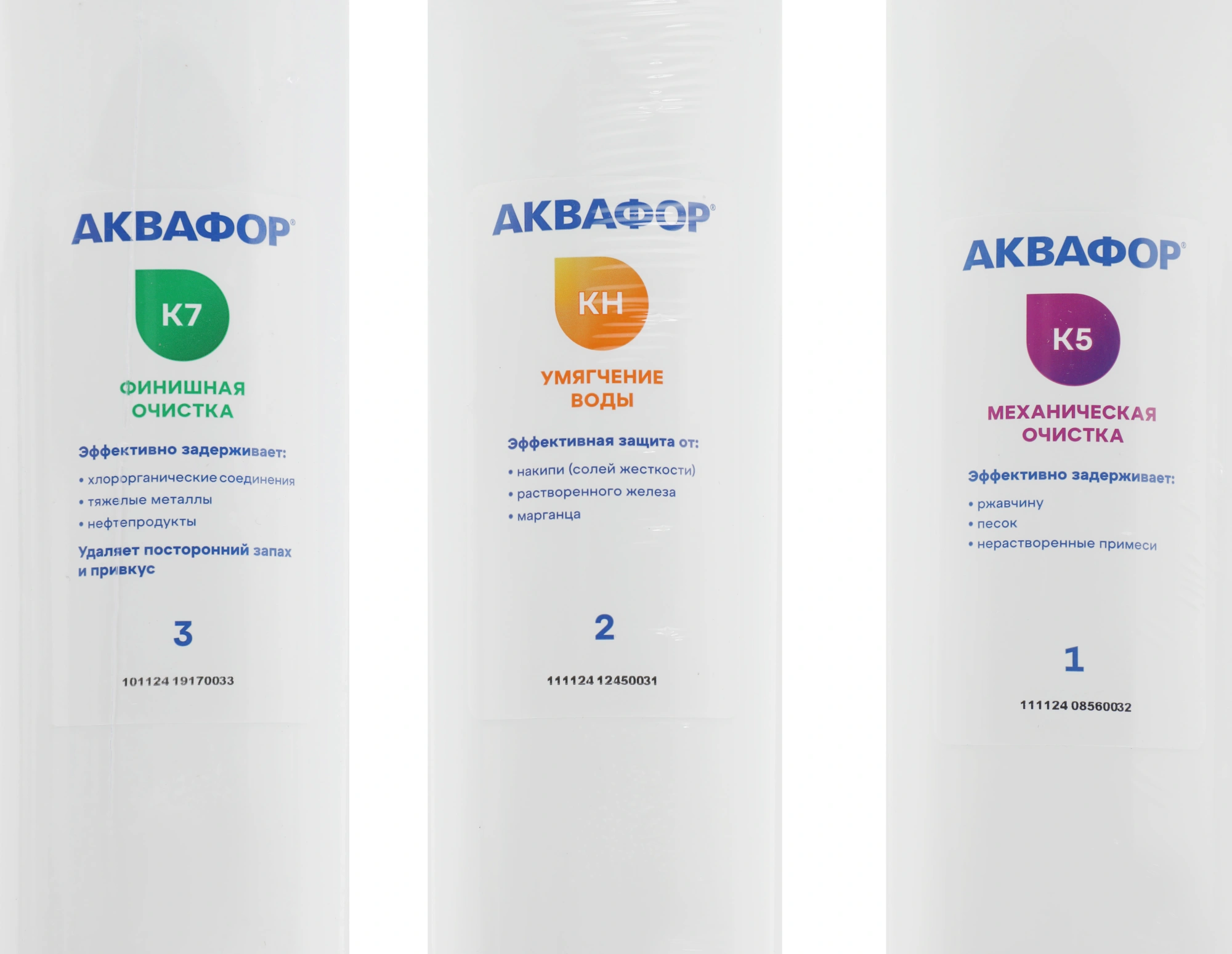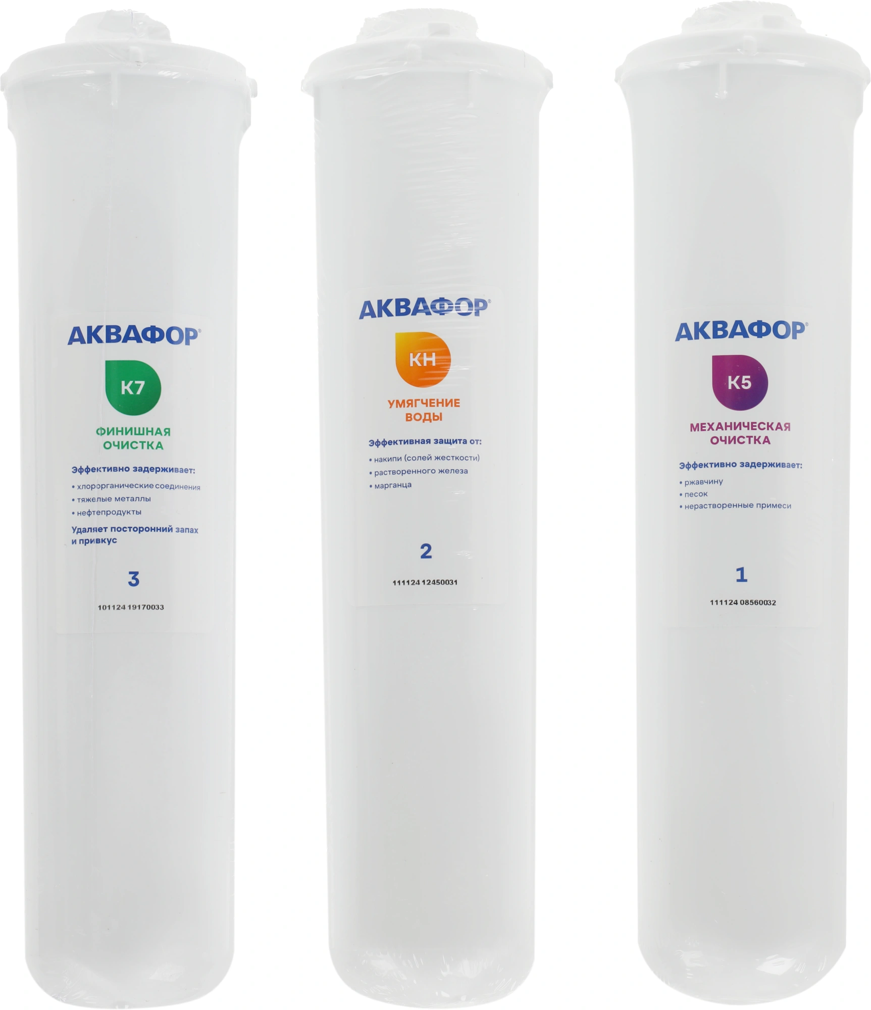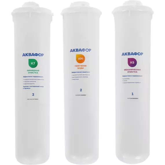 В комплект картриджей входят три модуля: K5 - предварительная очистка; KH - для умягчения воды умеренной или средней жесткости; K7 - финишная очистка.