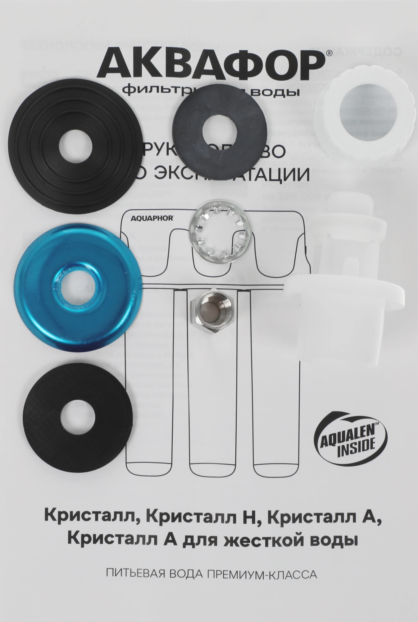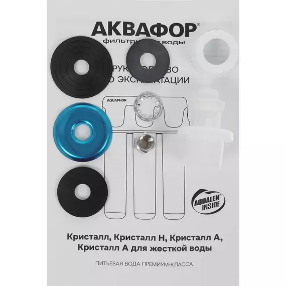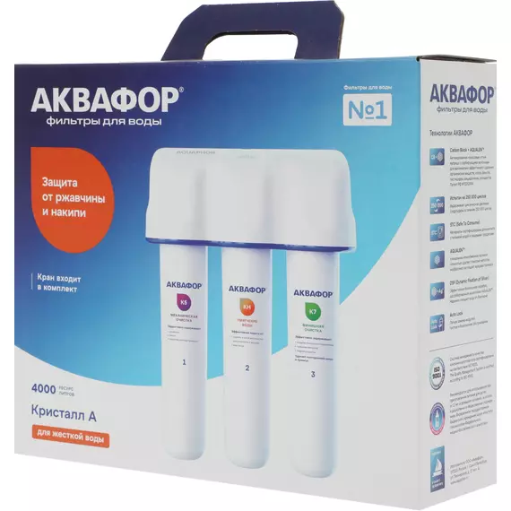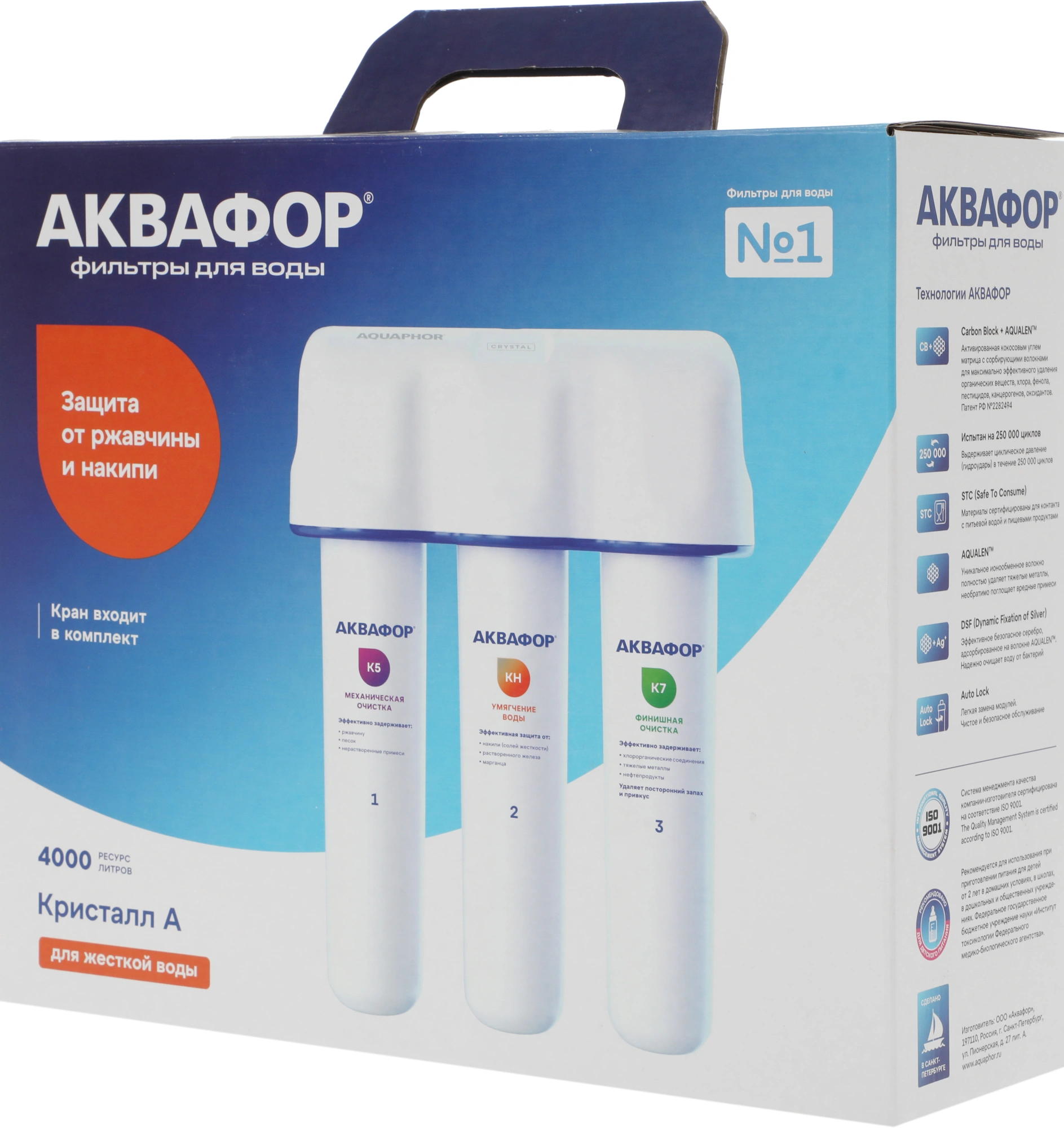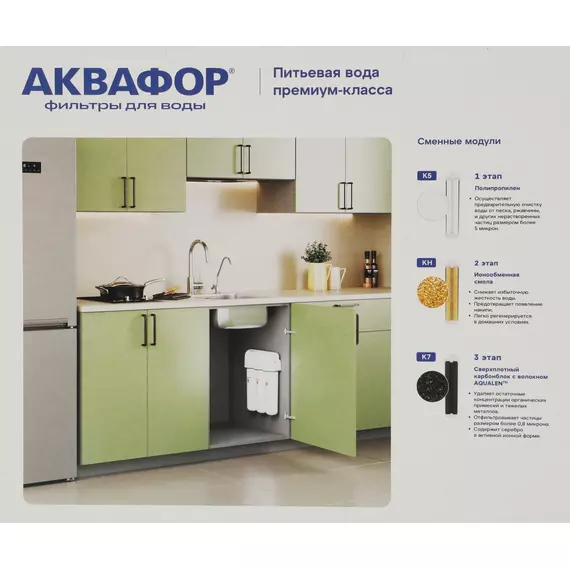 В комплект картриджей входят три модуля: K5 - предварительная очистка; KH - для умягчения воды умеренной или средней жесткости; K7 - финишная очистка.