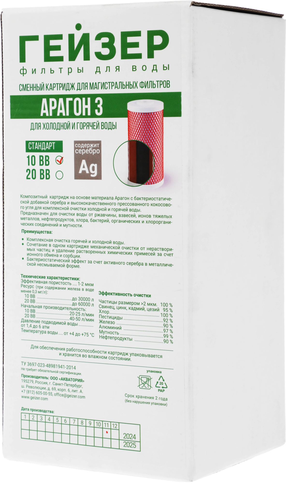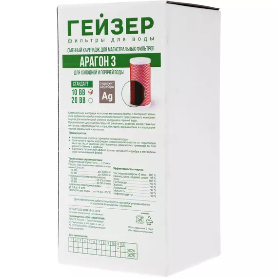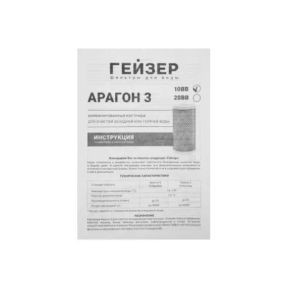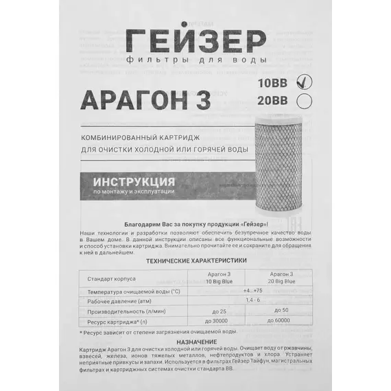 Картридж Гейзер Арагон 3 10ВВ для проточных фильтров ресурс: 30000л (упак. 1шт) [30054]